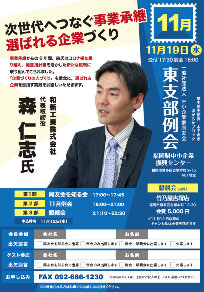 今回の報告では、和新工業株式会社 代表取締役 森氏より事業承継から6年間の歩みと取り組み、そしてコロナ禍を乗り越えてきた次世代経営者としての実践をご紹介いただきます。